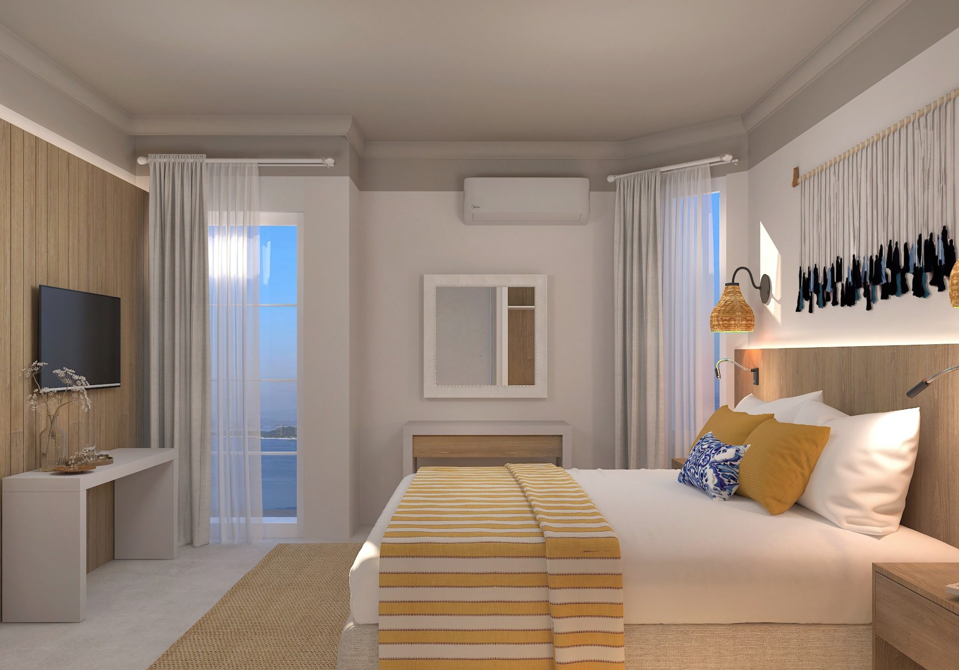Waking up here means opening your large windows to an endless blue horizon that stays with you all day. Inside, we kept the design very serene to match the unique Aegean spirit. This hotel family room is about more than just the physical space. It is about the feeling of being at home while looking at the infinite water. Enjoy your large terrace with your family in the evening and watch the lights flicker on the islands across the bay while the world slows down.